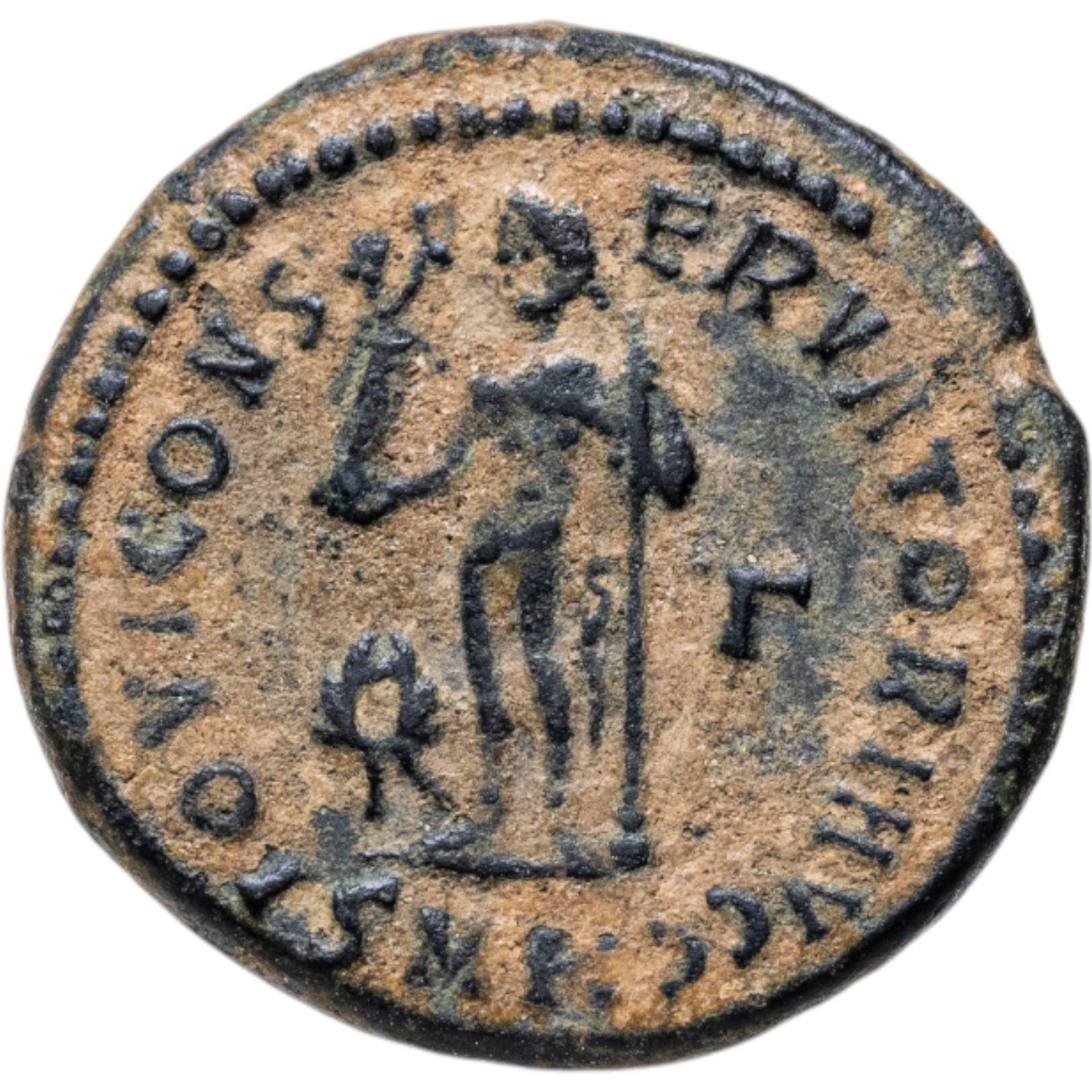 Реверс: IOVI CONSERVATORI AVGG, Юпитер стоит слева, держит Викторию на глобусе и скипетре; венок в левом поле, слева на поле литера Δ , SMK под обрезом .