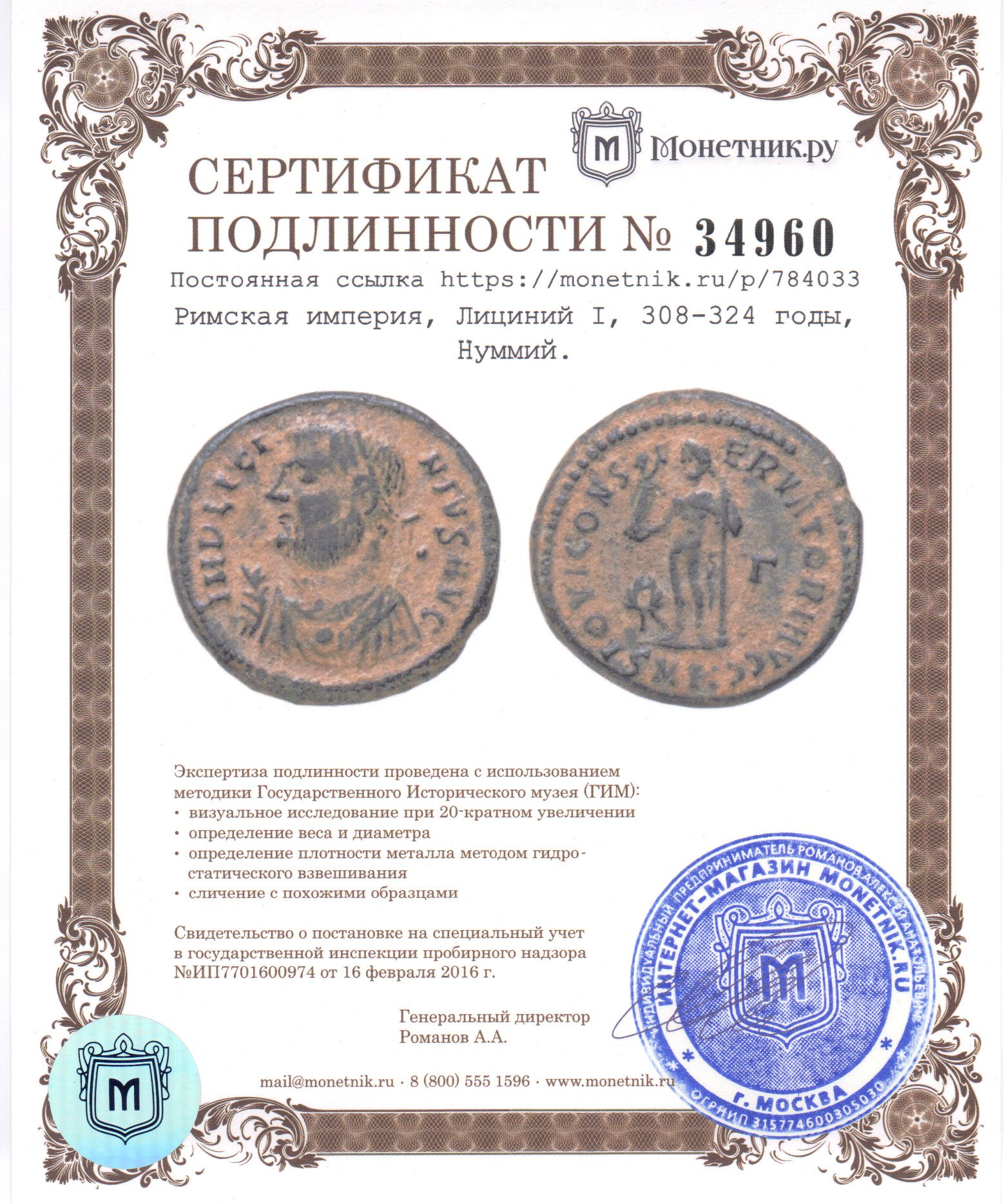 Аверс: IMP LICINIVS AVG, драпированный бюст императора в одежде триумфатора в лавровом венке, повёрнутый вправо, в левой руке держит маппу, в правой руке скипетр.