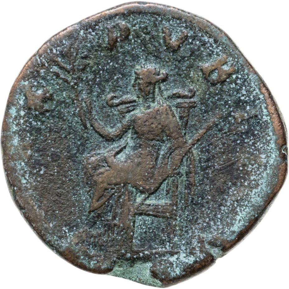 Реверс: PAX PVBLICA, Пация, персонификация Мира, сидящая на троне влево, в поднятой правой руке держит оливковую ветвь, в левой скипетр, под обрезом SC.