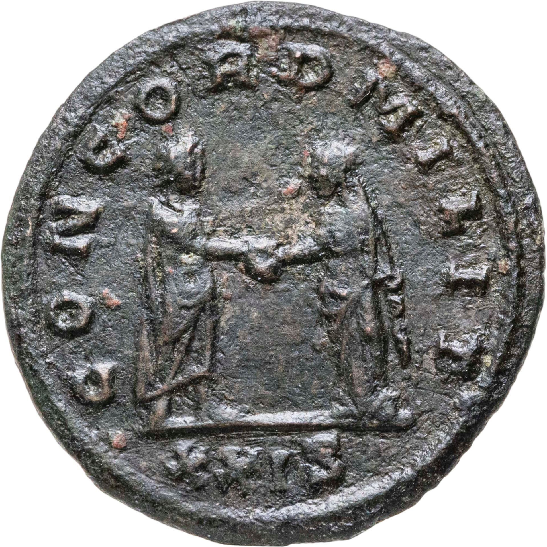 Реверс: CONCORD MILITVM, император в тоге стоит, повернувшись вправо, и пожимает руку Конкордии, персонификация Согласия, под обрезом XXIS.
