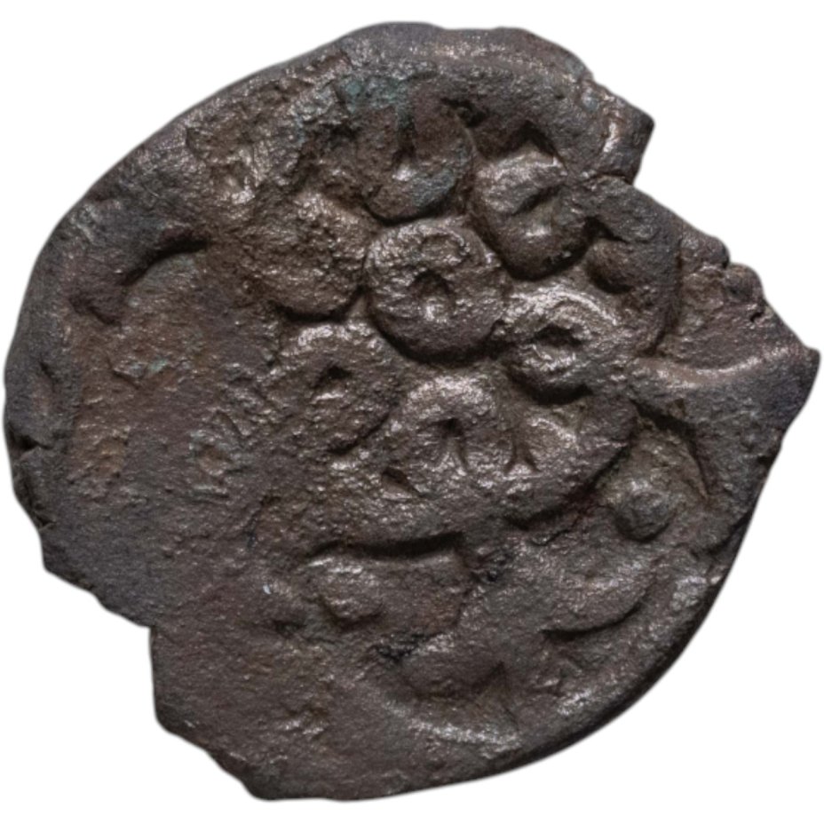 Оборотная сторона: В точечном круге фигурный 6-угольник, в котором легенда в 3 строки: Чекан Сарая / ал-Джадид / 751.