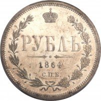 В центре указан номинал «РУБЛЬ». Над номиналом – Корона Российской империи. Под номиналом расположен декоративный разделитель в виде двух разнонаправленных фигурных линий и небольшой выпуклой точки между ними. Под разделителем — дата выпуска монеты «1864». Под цифрой даты — обозначение монетного двора «С.П.Б.». Вдоль канта, не доходя до короны, изображен венок из лавровой и дубовой ветви, которые в нижней части перевязаны лентой на узел бантом. По окружности канта имеются рельефные элементы, выполненные в виде зубцов.
