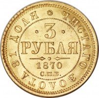 В центре указан номинал «3», ограниченный с обеих сторон шестиконечными звездочками. Под цифрой номинала — слово "РУБЛЯ". Ниже, расположен декоративный разделитель в виде двух разнонаправленных фигурных линий и небольшой выпуклой точки между ними. Под разделителем — дата выпуска монеты «1870». Под цифрой даты — обозначение монетного двора «С.П.Б.». Центральная часть отделена от остального изображения, окружностью в виде точек. За окружностью круговая надпись: «ЧИСТОГО ЗОЛОТА 81 ДОЛЯ», разделенная сверху цветочной розеткой. По окружности канта имеются рельефные элементы, выполненные в виде зубцов.