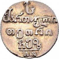 В центре надпись - надпись в две строки: «ქართლი თეთრი» (грузинское серебро). Над надписью грузинская цифра, обозначающая номинал - 200 динаров (20 копеек). Ниже надписи указан год чеканки. Под ним прямая черта. Под чертой буквы «А.К». Инициалы минцмейстера Алексея Карпинского.