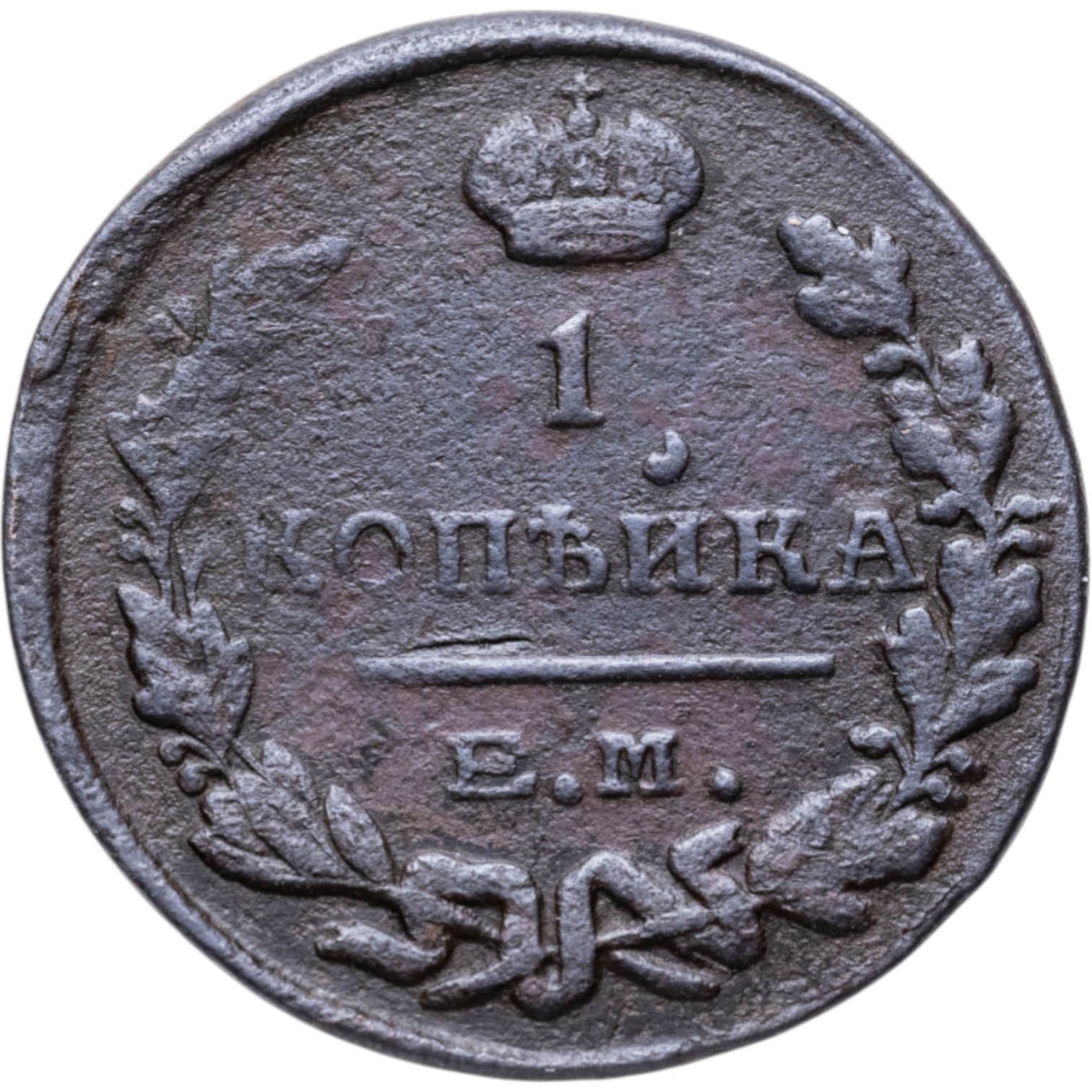 В центре указан номинал - цифра «1». Над цифрой - императорская корона. Под цифрой номинала — надпись «КОПЕЙКА». Под надписью - прямая черта, под ней - обозначение монетного двора «Е.М.». Вдоль канта, не доходя до короны, изображен венок из лавровой и дубовой ветви, которые в нижней части переплетены лентой. По окружности канта имеются рельефные элементы, выполненные в виде точек.