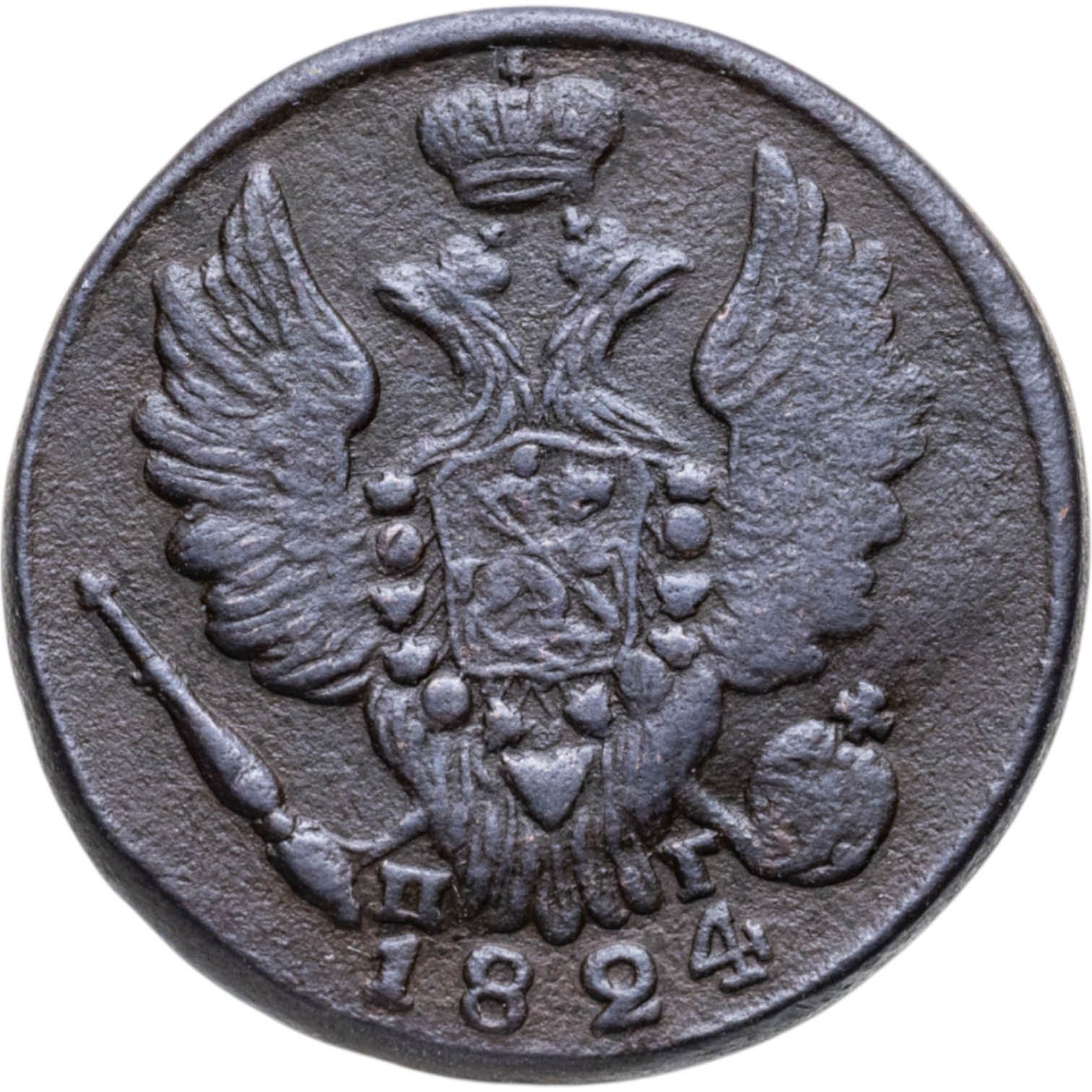 В центре изображен Государственный Герб Российской империи - двуглавый орёл с поднятыми вверх распущенными крыльями. Головы которого увенчаны двумя коронами, третья, большая корона над ними. На груди орла расположен Московский герб - щит с изображением Георгия Победоносца, поражающего копьем дракона. Вокруг щита орденская цепь с орденом Св. Апостола Андрея Первозванного. В правой лапе орла – скипетр, в левой – держава. Под правой лапой – буква «П», под левой – буква «Г». Инициалы минцмейстера Петра Грамматчикова. Под инициалами — дата выпуска монеты «1824». По окружности канта имеются рельефные элементы, выполненные в виде точек.