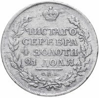 В центре надпись в четыре строки: «ЧИСТАГО»│«СЕРЕБРА»│«4 ЗОЛОТН.»│«21 ДОЛЯ.». Над надписью - императорская корона. Под надписью - прямая черта, под ней - обозначение Санкт-Петербургского монетного двора «С.П.Б.». Вдоль канта, не доходя до короны, изображен венок из лавровой и дубовой ветви, которые в нижней части переплетены лентой. По окружности канта имеются рельефные элементы, выполненные в виде зубцов.