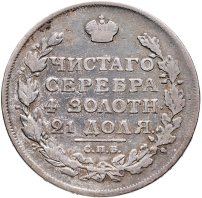 В центре надпись в четыре строки: «ЧИСТАГО»│«СЕРЕБРА»│«4 ЗОЛОТН.»│«21 ДОЛЯ.». Над надписью - императорская корона. Под надписью - прямая черта, под ней - обозначение Санкт-Петербургского монетного двора «С.П.Б.». Вдоль канта, не доходя до короны, изображен венок из лавровой и дубовой ветви, которые в нижней части переплетены лентой. По окружности канта имеются рельефные элементы, выполненные в виде зубцов.