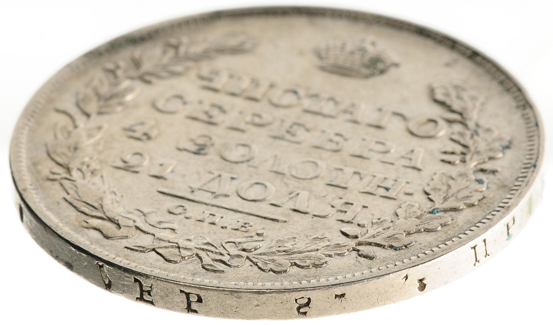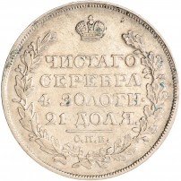 В центре надпись в четыре строки: «ЧИСТАГО»│«СЕРЕБРА»│«4 ЗОЛОТН.»│«21 ДОЛЯ.». Над надписью - императорская корона. Под надписью - прямая черта, под ней - обозначение Санкт-Петербургского монетного двора «С.П.Б.». Вдоль канта, не доходя до короны, изображен венок из лавровой и дубовой ветви, которые в нижней части переплетены лентой. По окружности канта имеются рельефные элементы, выполненные в виде зубцов.