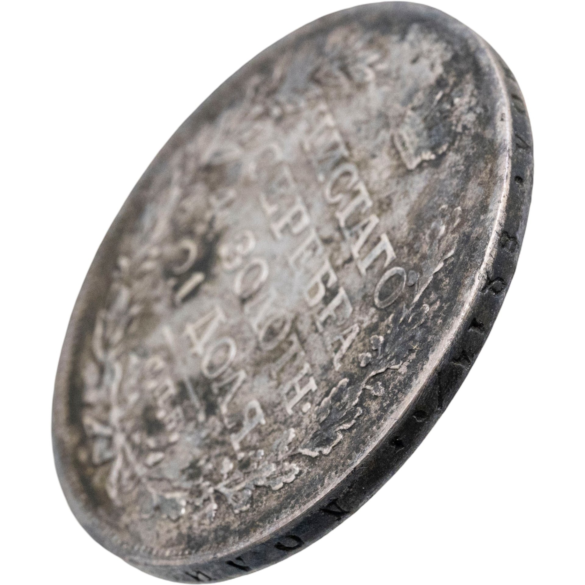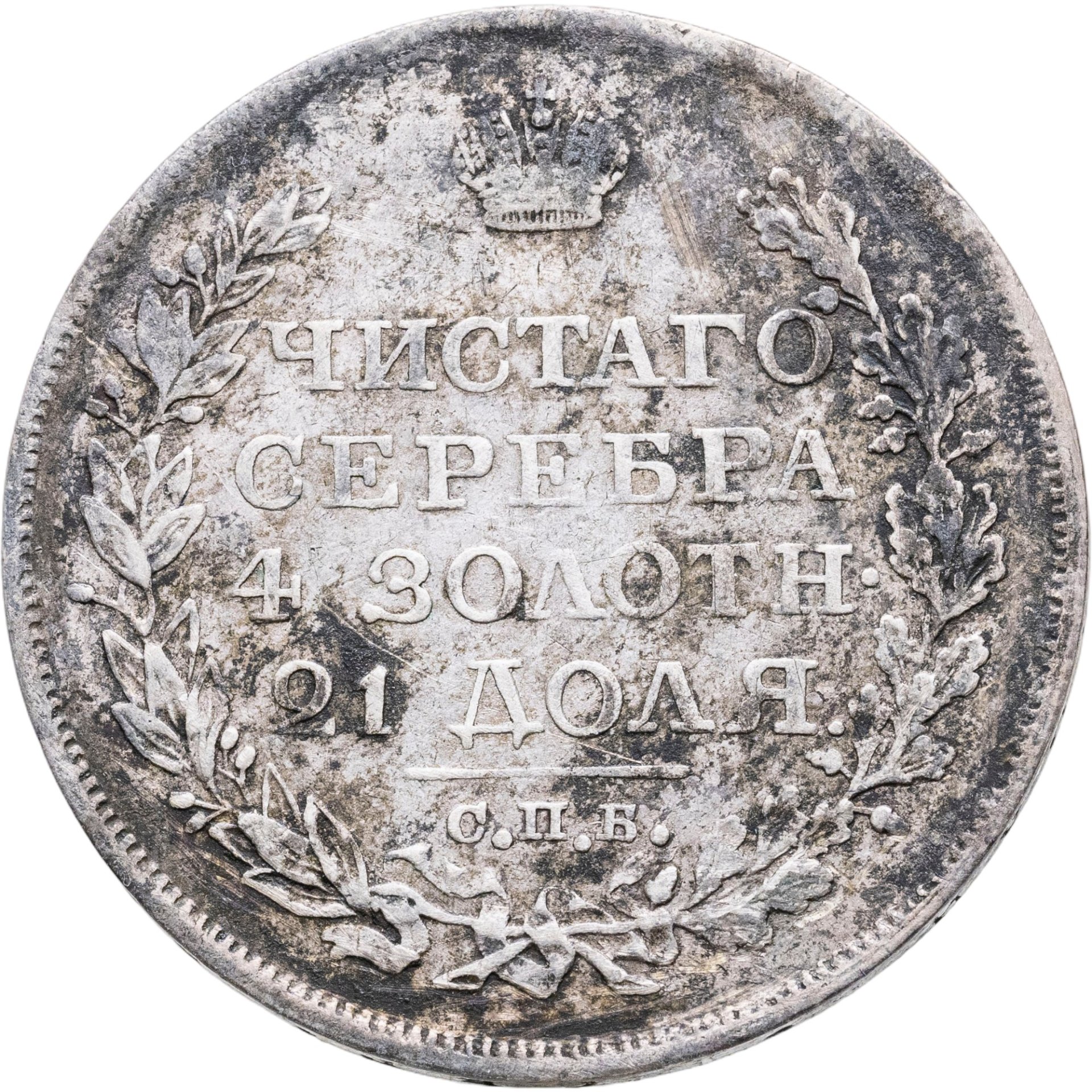 В центре надпись в четыре строки: «ЧИСТАГО»│«СЕРЕБРА»│«4 ЗОЛОТН.»│«21 ДОЛЯ.». Над надписью - императорская корона. Под надписью - прямая черта, под ней - обозначение Санкт-Петербургского монетного двора «С.П.Б.». Вдоль канта, не доходя до короны, изображен венок из лавровой и дубовой ветви, которые в нижней части переплетены лентой. По окружности канта имеются рельефные элементы, выполненные в виде зубцов.
