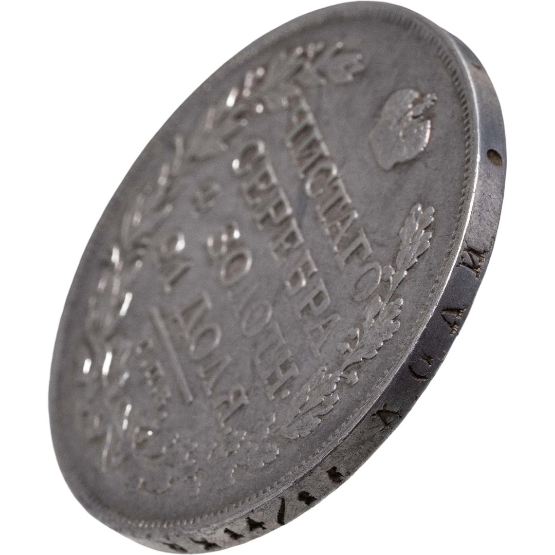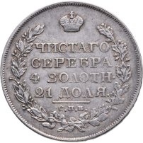 В центре надпись в четыре строки: «ЧИСТАГО»│«СЕРЕБРА»│«4 ЗОЛОТН.»│«21 ДОЛЯ.». Над надписью - императорская корона. Под надписью - прямая черта, под ней - обозначение Санкт-Петербургского монетного двора «С.П.Б.». Вдоль канта, не доходя до короны, изображен венок из лавровой и дубовой ветви, которые в нижней части переплетены лентой. По окружности канта имеются рельефные элементы, выполненные в виде зубцов.