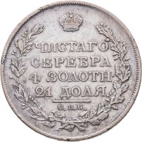 В центре надпись в четыре строки: «ЧИСТАГО»│«СЕРЕБРА»│«4 ЗОЛОТН.»│«21 ДОЛЯ.». Над надписью - императорская корона. Под надписью - прямая черта, под ней - обозначение Санкт-Петербургского монетного двора «С.П.Б.». Вдоль канта, не доходя до короны, изображен венок из лавровой и дубовой ветви, которые в нижней части переплетены лентой. По окружности канта имеются рельефные элементы, выполненные в виде зубцов.