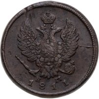 В центре изображен Государственный Герб Российской империи - двуглавый орёл с поднятыми вверх распущенными крыльями. Головы которого увенчаны двумя коронами, третья, большая корона над ними. На груди орла расположен Московский герб - щит с изображением Георгия Победоносца, поражающего копьем дракона. Вокруг щита орденская цепь с орденом Св. Апостола Андрея Первозванного. В правой лапе орла – скипетр, в левой – держава. Под правой лапой – буква «Н», под левой – буква «М». Инициалы минцмейстера Николая Мундта. Под инициалами — дата выпуска монеты «1811». По окружности канта имеются рельефные элементы, выполненные в виде точек.