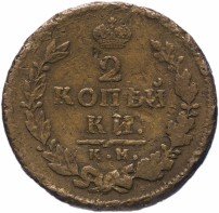 В центре указан номинал - цифра «2». Над цифрой - императорская корона. Под цифрой номинала — надпись в две строки: «КОПЕЙ»│«КИ.». Под надписью - прямая черта, под ней - обозначение монетного двора «К.М.». Вдоль канта, не доходя до короны, изображен венок из лавровой и дубовой ветви, которые в нижней части переплетены лентой. По окружности канта имеются рельефные элементы, выполненные в виде точек.