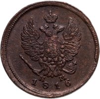 В центре изображен Государственный Герб Российской империи - двуглавый орёл с поднятыми вверх распущенными крыльями. Головы которого увенчаны двумя коронами, третья, большая корона над ними. На груди орла расположен Московский герб - щит с изображением Георгия Победоносца, поражающего копьем дракона. Вокруг щита орденская цепь с орденом Св. Апостола Андрея Первозванного. В правой лапе орла – скипетр, в левой – держава. Под правой лапой – буква «Н», под левой – буква «М». Инициалы минцмейстера Николая Мундта. Под инициалами — дата выпуска монеты «1816». По окружности канта имеются рельефные элементы, выполненные в виде точек.