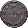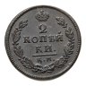 В центре указан номинал - цифра «2». Над цифрой - императорская корона. Под цифрой номинала — надпись в две строки: «КОПЕЙ»│«КИ.». Под надписью - прямая черта, под ней - обозначение монетного двора «К.М.». Вдоль канта, не доходя до короны, изображен венок из лавровой и дубовой ветви, которые в нижней части переплетены лентой. По окружности канта имеются рельефные элементы, выполненные в виде точек.
