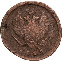 В центре изображен Государственный Герб Российской империи - двуглавый орёл с поднятыми вверх распущенными крыльями. Головы которого увенчаны двумя коронами, третья, большая корона над ними. На груди орла расположен Московский герб - щит с изображением Георгия Победоносца, поражающего копьем дракона. Вокруг щита орденская цепь с орденом Св. Апостола Андрея Первозванного. В правой лапе орла – скипетр, в левой – держава. Под правой лапой – буква «Н», под левой – буква «М». Инициалы минцмейстера Николая Мундта. Под инициалами — дата выпуска монеты «1819». По окружности канта имеются рельефные элементы, выполненные в виде точек.