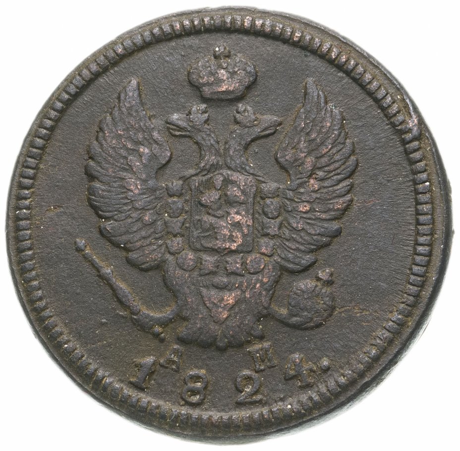 В центре изображен Государственный Герб Российской империи - двуглавый орёл с поднятыми вверх распущенными крыльями. Головы которого увенчаны двумя коронами, третья, большая корона над ними. На груди орла расположен Московский герб - щит с изображением Георгия Победоносца, поражающего копьем дракона. Вокруг щита орденская цепь с орденом Св. Апостола Андрея Первозванного. В правой лапе орла – скипетр, в левой – держава. Под правой лапой – буква «А», под левой – буква «М». Инициалы минцмейстера Андрея Мевиуса. Под инициалами — дата выпуска монеты «1824.». По окружности канта имеются рельефные элементы, выполненные в виде точек.