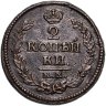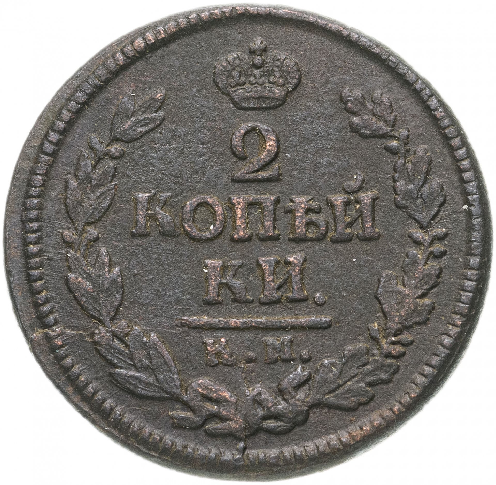 В центре указан номинал - цифра «2». Над цифрой - императорская корона. Под цифрой номинала — надпись в две строки: «КОПЕЙ»│«КИ». Под надписью - прямая черта, под ней - обозначение монетного двора «К.М.». Вдоль канта, не доходя до короны, изображен венок из лавровой и дубовой ветви, которые в нижней части переплетены лентой. По окружности канта имеются рельефные элементы, выполненные в виде точек.