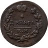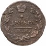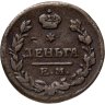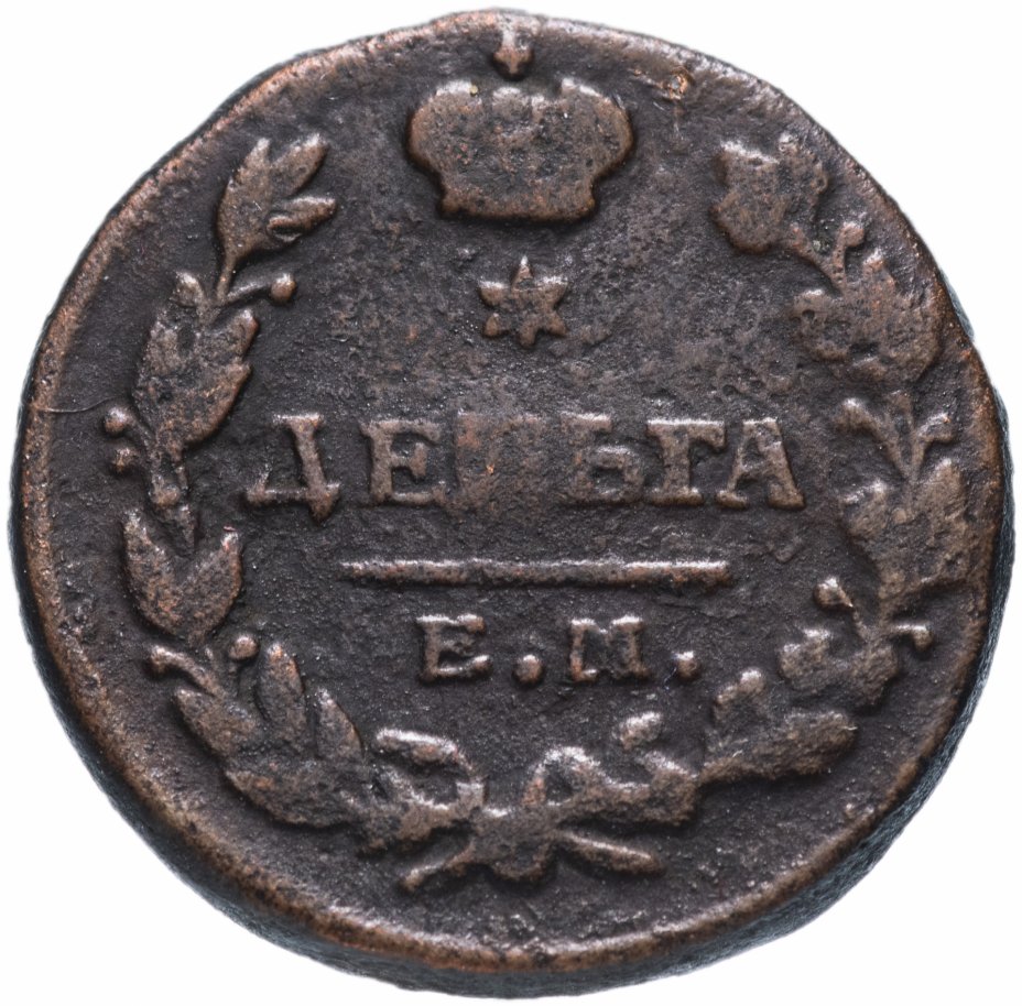 В центре указан номинал - надпись «ДЕНЬГА». Над обозначением номинала - шестиконечная звезда. Над ней - императорская корона. Под надписью - прямая черта, под ней - обозначение монетного двора «Е.М.». Вдоль канта, не доходя до короны, изображен венок из лавровой и дубовой ветви, которые в нижней части переплетены лентой. По окружности канта имеются рельефные элементы, выполненные в виде точек.