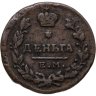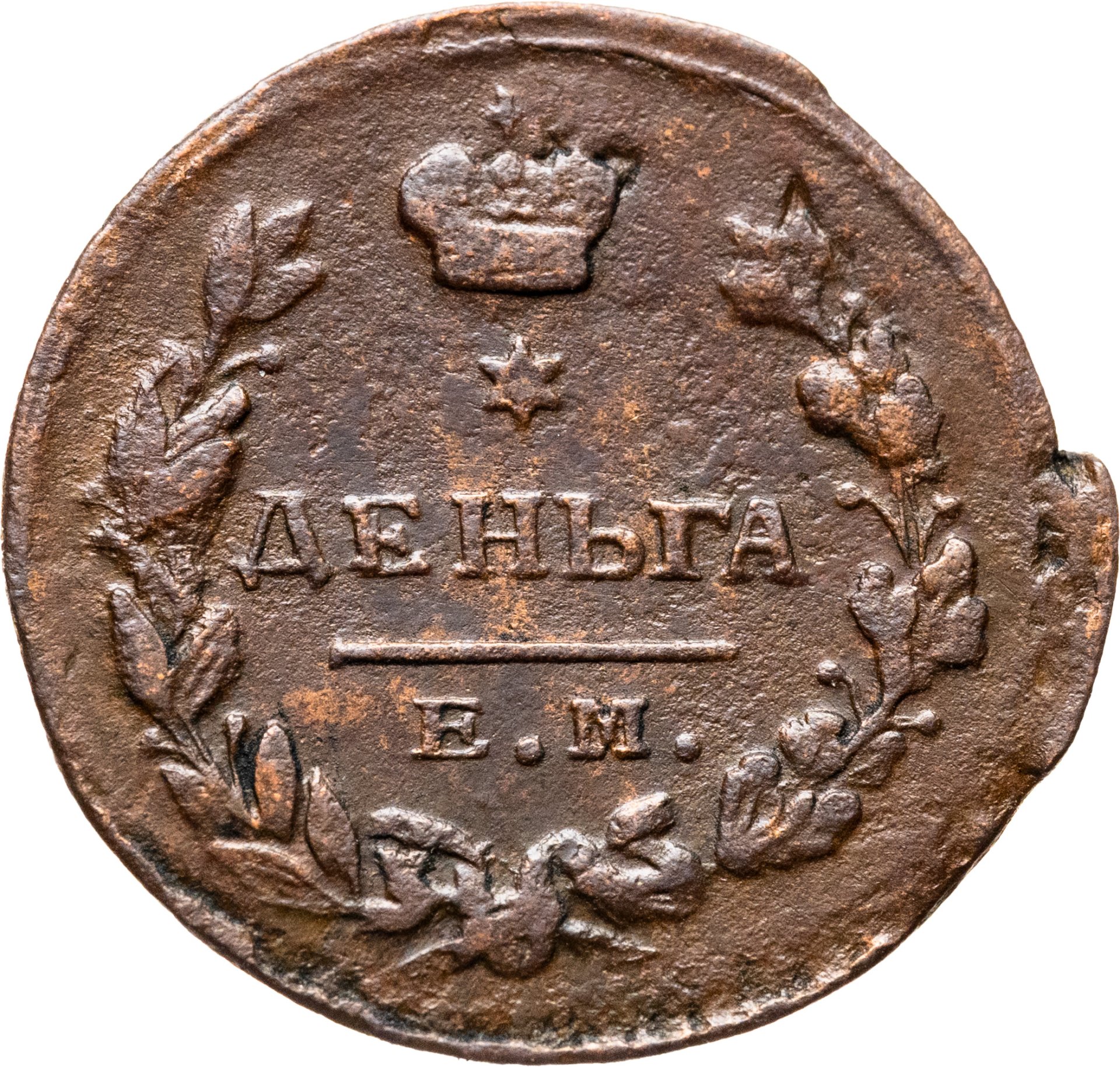 В центре указан номинал - надпись «ДЕНЬГА». Над обозначением номинала - шестиконечная звезда. Над ней - императорская корона. Под надписью - прямая черта, под ней - обозначение монетного двора «Е.М.». Вдоль канта, не доходя до короны, изображен венок из лавровой и дубовой ветви, которые в нижней части переплетены лентой. По окружности канта имеются рельефные элементы, выполненные в виде точек.
