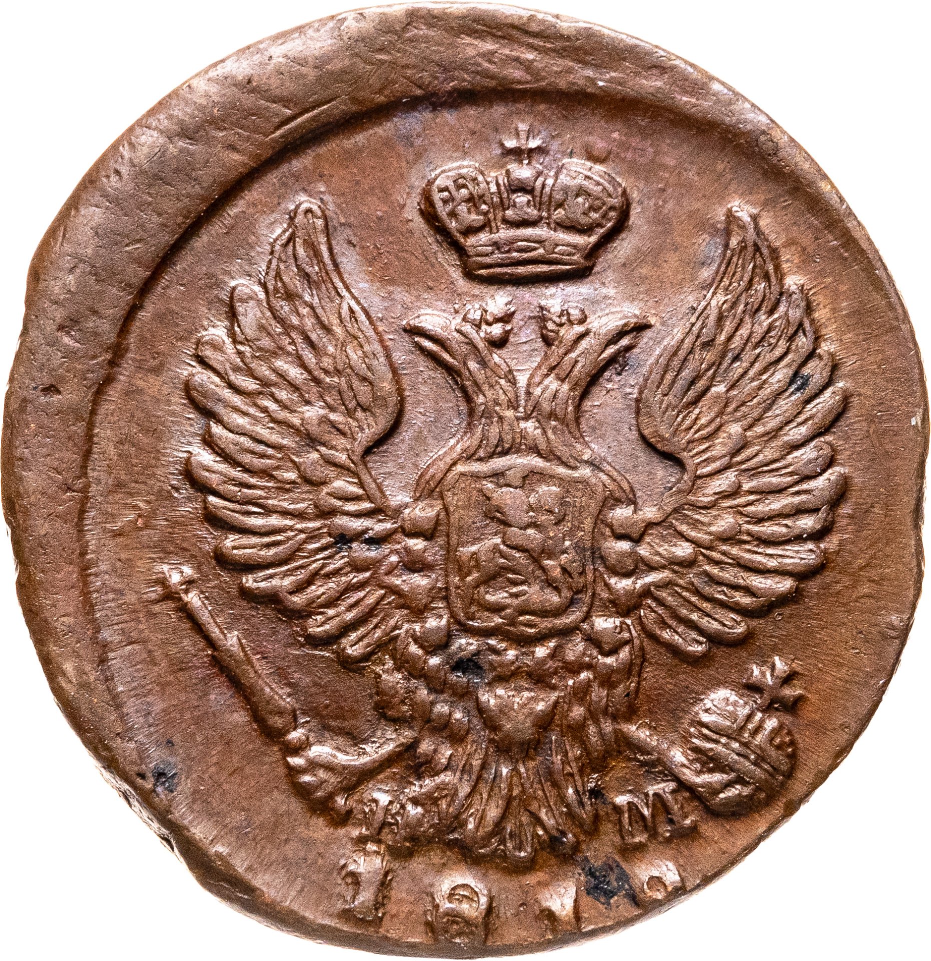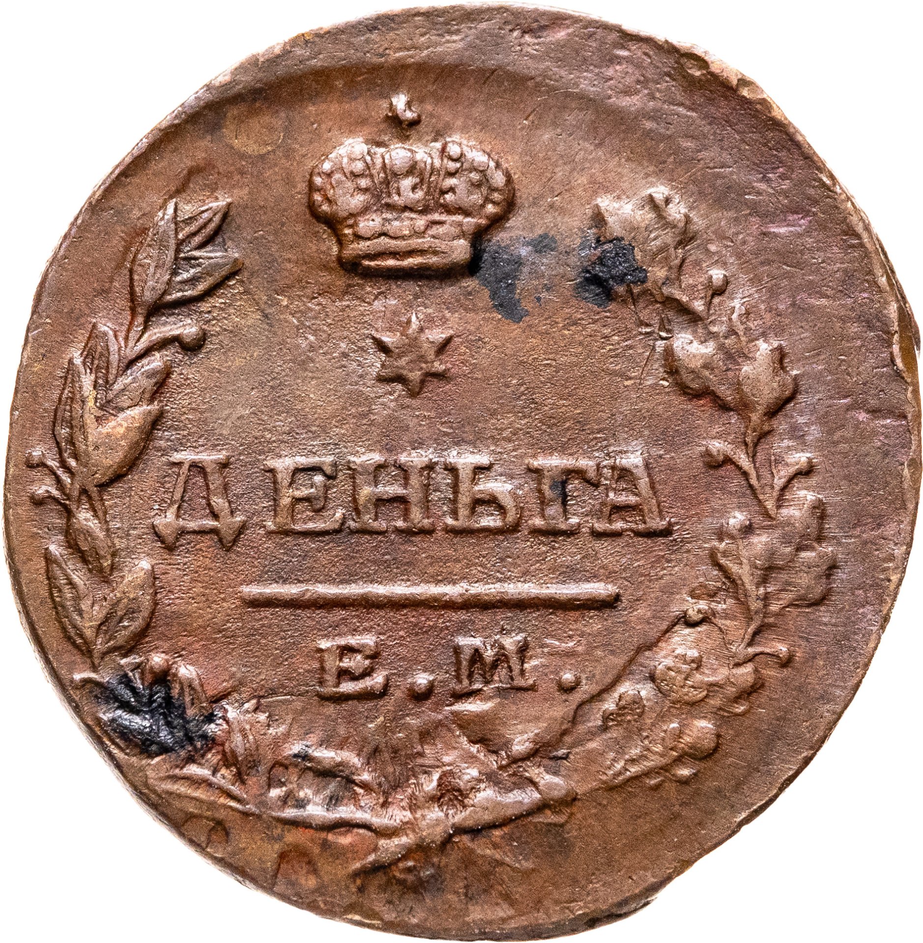 В центре указан номинал - надпись «ДЕНЬГА». Над обозначением номинала - шестиконечная звезда. Над ней - императорская корона. Под надписью - прямая черта, под ней - обозначение монетного двора «Е.М.». Вдоль канта, не доходя до короны, изображен венок из лавровой и дубовой ветви, которые в нижней части переплетены лентой. По окружности канта имеются рельефные элементы, выполненные в виде точек.