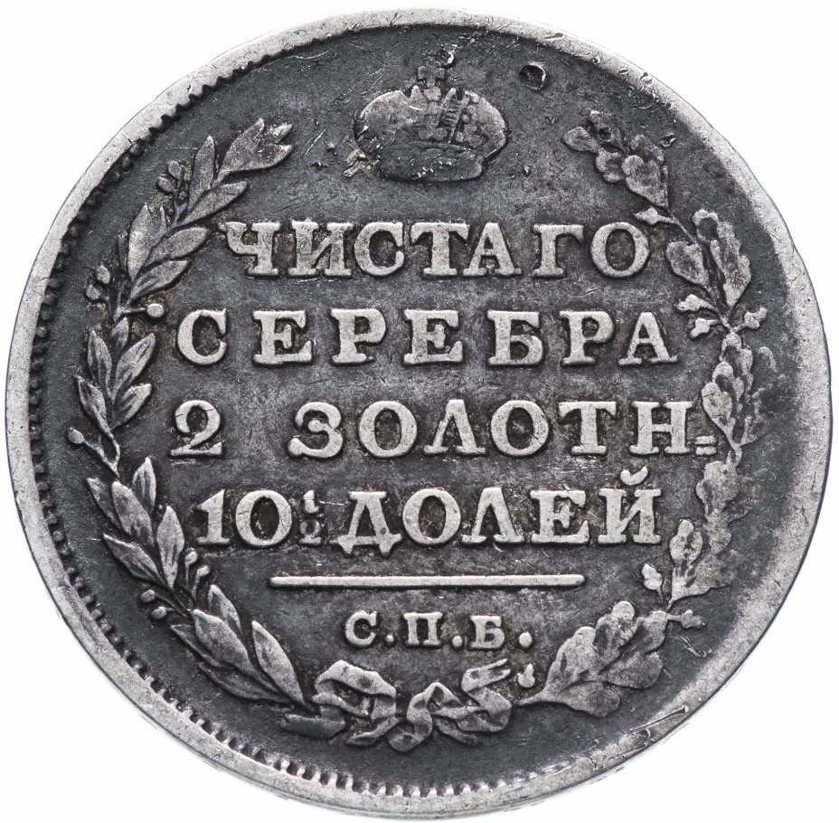 В центре надпись в четыре строки: «ЧИСТАГО»│«СЕРЕБРА»│«2 ЗОЛОТН=»│«10 1/2 ДОЛЕЙ». Над надписью - императорская корона. Под надписью - прямая черта, под ней - обозначение Санкт-Петербургского монетного двора «С.П.Б.». Вдоль канта, не доходя до короны, изображен венок из лавровой и дубовой ветви, которые в нижней части переплетены лентой. По окружности канта имеются рельефные элементы, выполненные в виде зубцов.