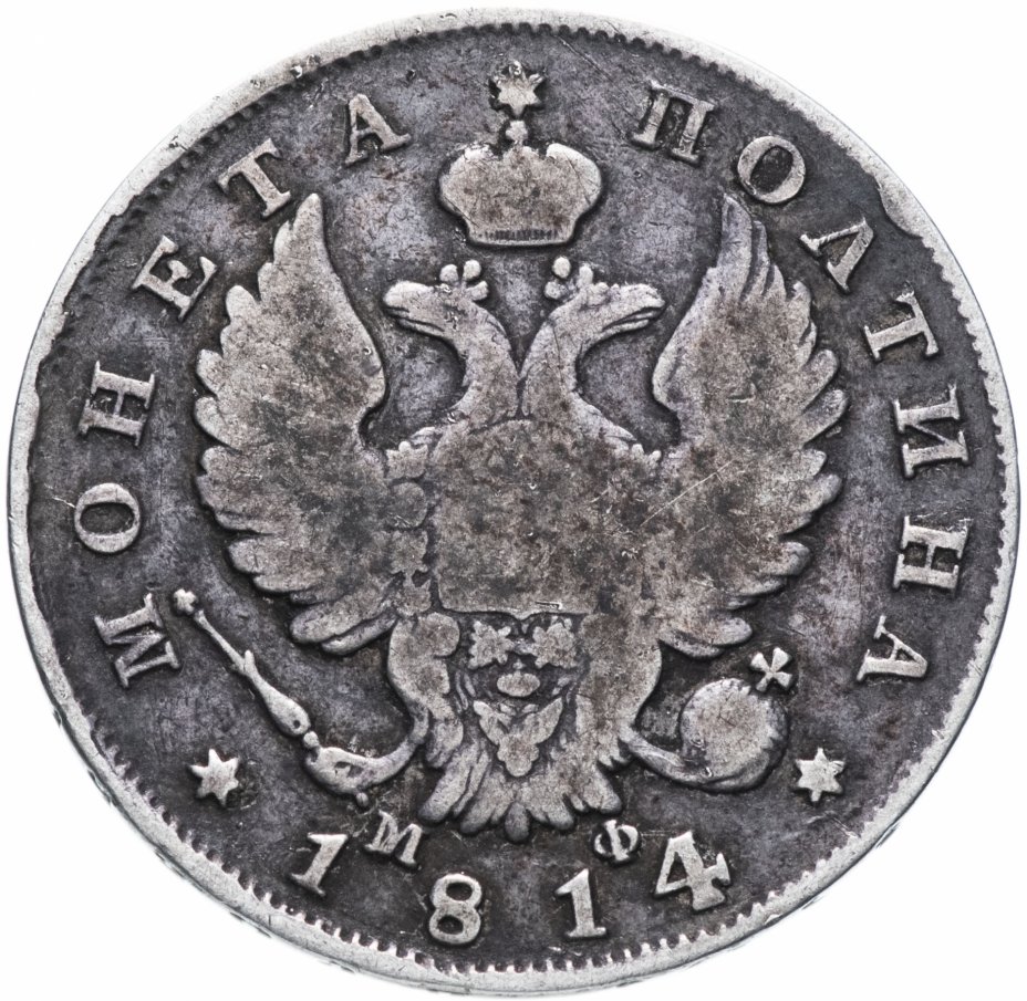 В центре изображен Государственный Герб Российской империи - двуглавый орёл с поднятыми вверх распущенными крыльями. Головы которого увенчаны двумя коронами, третья, большая корона над ними. На груди орла расположен Московский герб - щит с изображением Георгия Победоносца, поражающего копьем дракона. Вокруг щита орденская цепь с орденом Св. Апостола Андрея Первозванного. В правой лапе орла – скипетр, в левой – держава. Под правой лапой – буква «М», под левой – буква «Ф». Инициалы минцмейстера Михаила Федорова. Слева от герба круговая надпись - «МОНЕТА», справа - «ПОЛТИНА». Под инициалами — дата выпуска монеты «1814». Все три надписи разделены между собой тремя шестиконечными звёздами. По окружности канта имеются рельефные элементы, выполненные в виде зубцов.