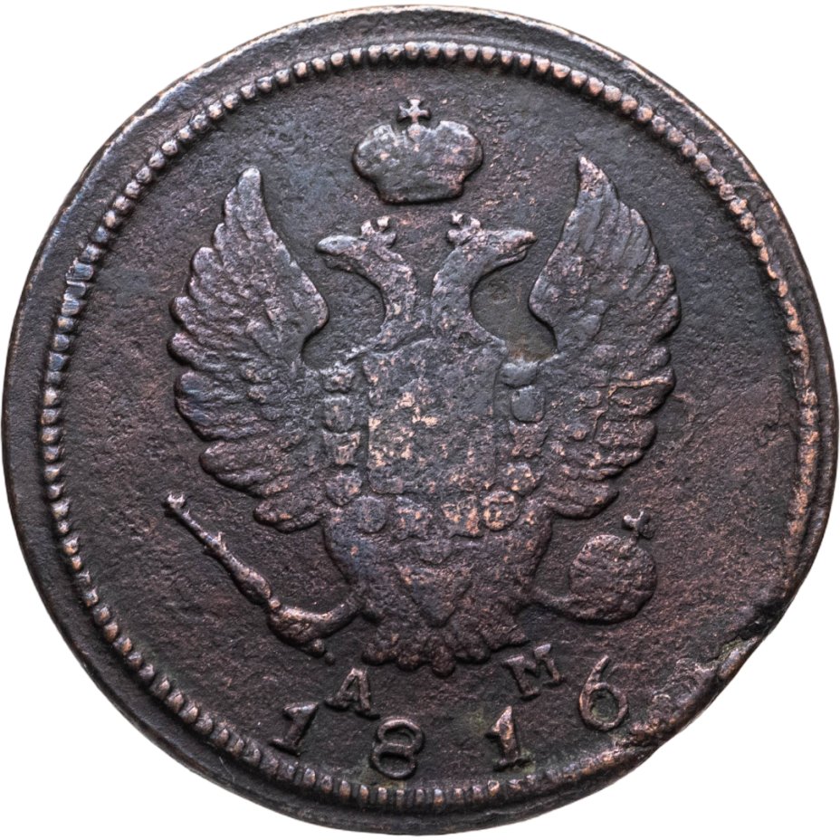 - Медные монеты имеют номиналы 1, 2, 5 копеек, 1 деньга, 1 полушка. На них чеканится двуглавый орёл в окружности на аверсе, номинал и год на реверсе. Кроме того, на монетах ставят выпуклые точки по окружности соответственно номиналу. Эта практика впервые введена при правлении Петра I.