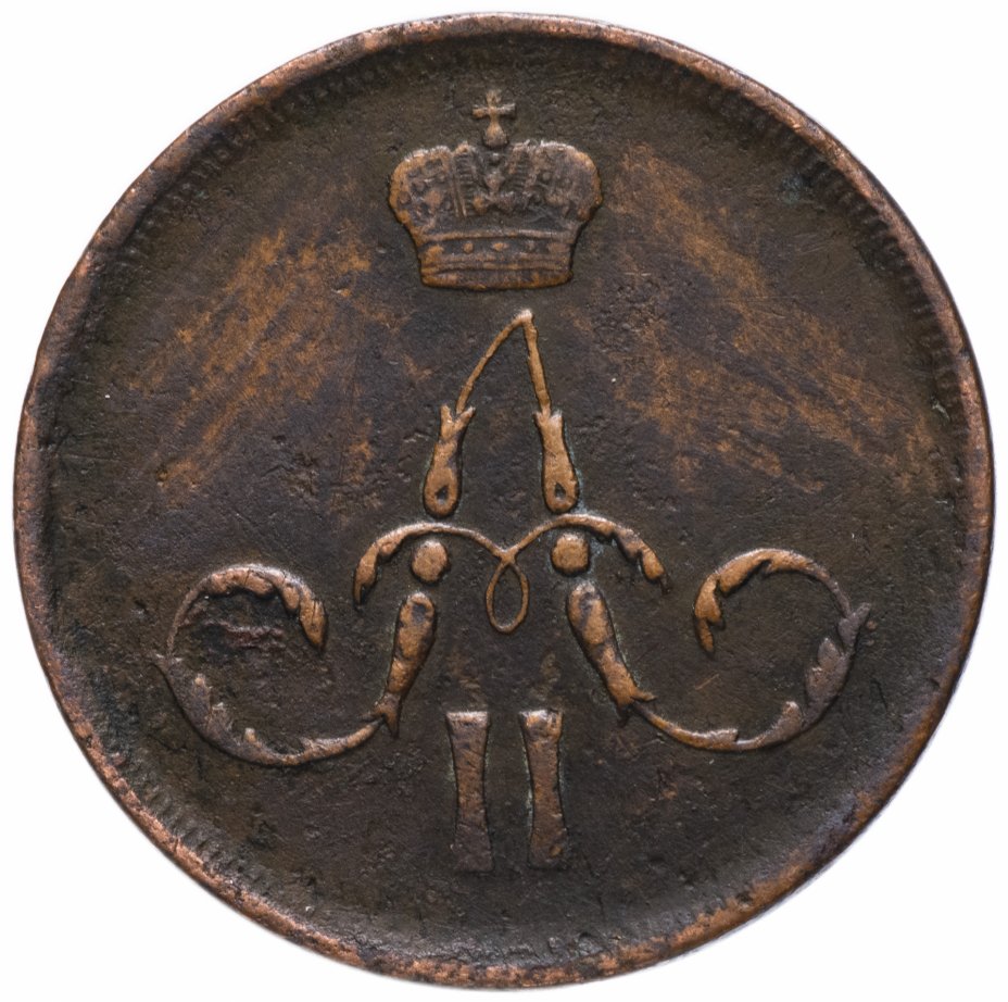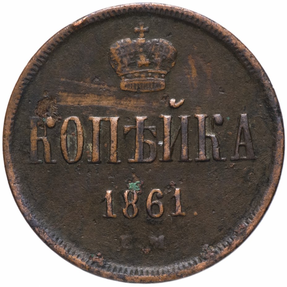 В центе обозначение номинала - слово «КОПЕЙКА». Выше - Корона Российской империи. Ниже - год выпуска монеты «1861.» и под годом - обозначение монетного двора буквы «Е.М.».
