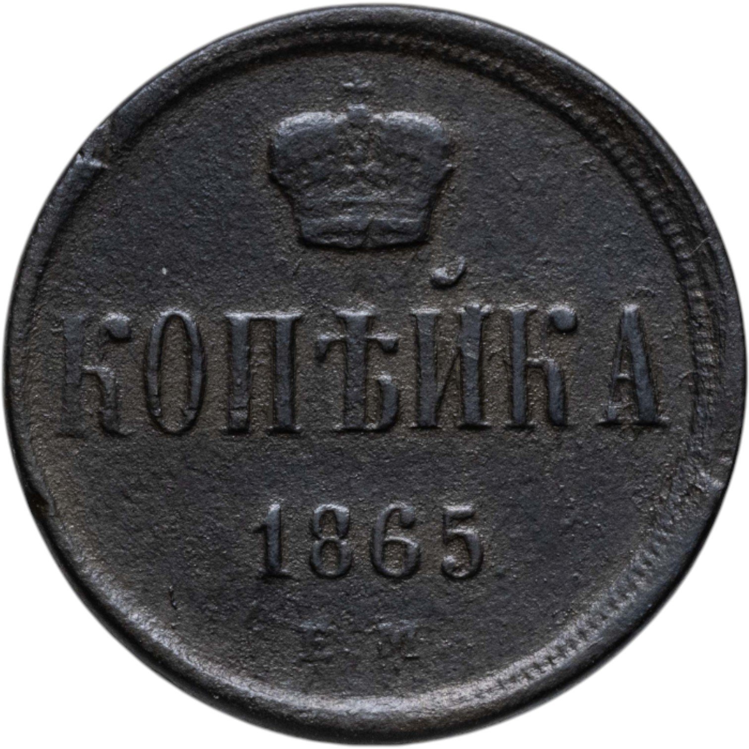 В центе обозначение номинала - слово «КОПЕЙКА». Выше - Корона Российской империи. Ниже - год выпуска монеты «1865.» и под годом - обозначение монетного двора буквы «Е.М.».