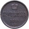 В центе обозначение номинала - слово «КОПЕЙКА». Выше - Корона Российской империи. Ниже - год выпуска монеты «1866.» и под годом - обозначение монетного двора буквы «Е.М.».
