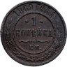 В центре монеты изображен Малый Государственный Герб Российской империи - двуглавый орел, головы которого увенчаны двумя коронами, третья, большая корона над ними. Все они соединены лентой Андрея Первозванного. В правой лапе орла – скипетр, в левой – держава. На его груди расположен Московский герб, в щите изображен Георгий Победоносец с копьем поражающий дракона. Вокруг щита цепь ордена Св. Апостола Андрея Первозванного. На крыльях орла изображены гербы: Царства Казанского, Польского, Херсонеса Таврического, Астраханского, Сибирского, Грузинского и герб соединенных княжеств Киевского, Новгородского и Владимирского — по 4 на каждое крыло. По окружности - две полукруглые плашки, соединенные узорами. На верхней плашке выпуклая надпись: "МЕДНАЯ РОССИЙСКАЯ МОНЕТА". На нижней плашке, изображенной в виде ленты, углубленная надпись: "ОДНА КОПЕЙКА".