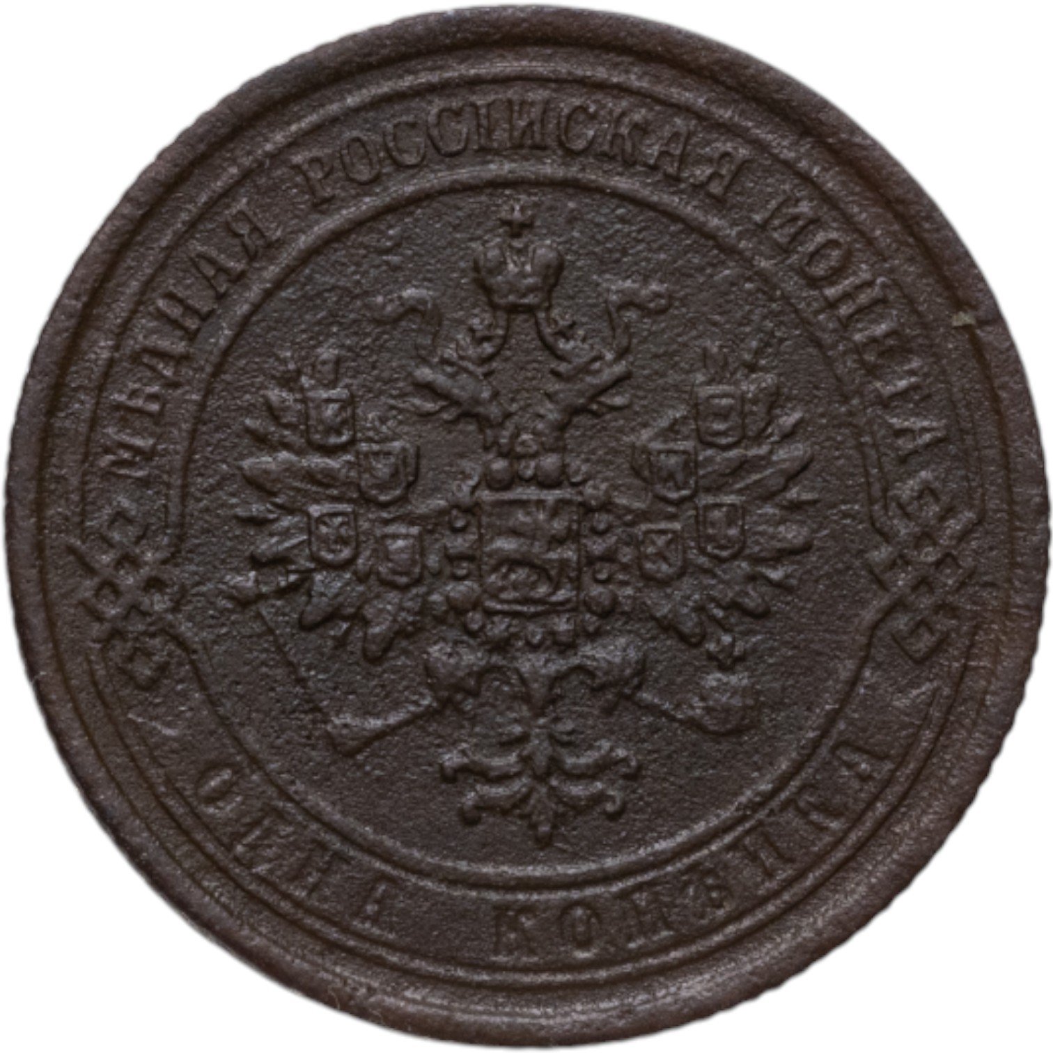 В центре монеты изображен Малый Государственный Герб Российской империи - двуглавый орел, головы которого увенчаны двумя коронами, третья, большая корона над ними. Все они соединены лентой Андрея Первозванного. В правой лапе орла – скипетр, в левой – держава. На его груди расположен Московский герб, в щите изображен Георгий Победоносец с копьем поражающий дракона. Вокруг щита цепь ордена Св. Апостола Андрея Первозванного. На крыльях орла изображены гербы: Царства Казанского, Польского, Херсонеса Таврического, Астраханского, Сибирского, Грузинского и герб соединенных княжеств Киевского, Новгородского и Владимирского — по 4 на каждое крыло. По окружности - две полукруглые плашки, соединенные узорами. На верхней плашке выпуклая надпись: "МЕДНАЯ РОССИЙСКАЯ МОНЕТА". На нижней плашке, изображенной в виде ленты, углубленная надпись: "ОДНА КОПЕЙКА".