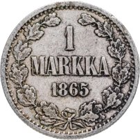 В центре - надпись в три строки: «1»│«MARKAA»│«1865». Вдоль канта изображён не замкнутый венок из двух дубовых ветвей, которые, в нижней части, перевязаны лентой на узел двойным бантом. По окружности канта имеются рельефные элементы, выполненные в виде зубцов.