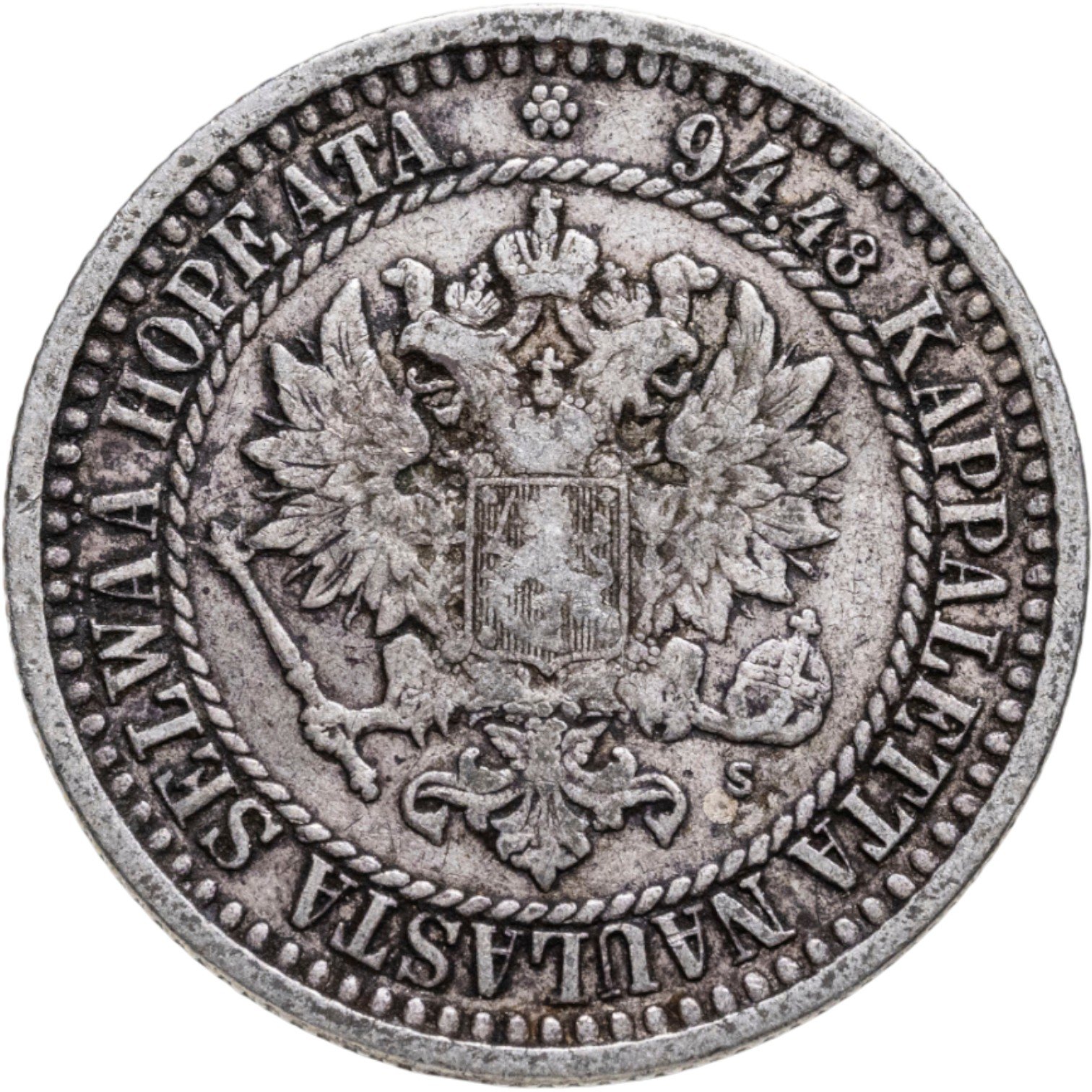 В центре изображён полный Герб Великого княжества Финляндского - двуглавый орёл, головы которого увенчаны двумя коронами, третья, большая корона над ними. Все они соединены орденской лентой ордена Св. Апостола Андрея Первозванного. На груди орла расположен щит с титульным гербом Великого князя Финляндского, увенчанный княжеской короной. Вокруг щита орденская цепь с орденом Св. Апостола Андрея Первозванного. В правой лапе орла – скипетр, в левой – держава. Под левой лапой знак директора Гельсингфосского монетного двора - литера «S», August Frederick Soldan (Август Фридрих Сольдан). Вокруг центрального изображения - витой ободок. За ободком круговая надпись: «94.48 KAPPALETTA NAULASTA SELWÄÄ HOPEATA», сверху разделённая цветочной розеткой. По окружности канта имеются рельефные элементы, выполненные в виде зубцов.