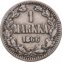В центре - надпись в три строки: «1»│«MARKAA»│«1866». Вдоль канта изображён не замкнутый венок из двух дубовых ветвей, которые, в нижней части, перевязаны лентой на узел двойным бантом. По окружности канта имеются рельефные элементы, выполненные в виде зубцов.