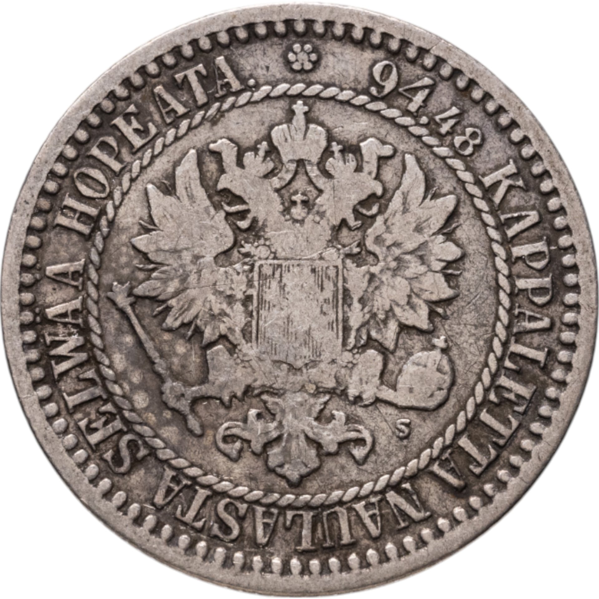 В центре изображён полный Герб Великого княжества Финляндского - двуглавый орёл, головы которого увенчаны двумя коронами, третья, большая корона над ними. Все они соединены орденской лентой ордена Св. Апостола Андрея Первозванного. На груди орла расположен щит с титульным гербом Великого князя Финляндского, увенчанный княжеской короной. Вокруг щита орденская цепь с орденом Св. Апостола Андрея Первозванного. В правой лапе орла – скипетр, в левой – держава. Под левой лапой знак директора Гельсингфосского монетного двора - литера «S», August Frederick Soldan (Август Фридрих Сольдан). Вокруг центрального изображения - витой ободок. За ободком круговая надпись: «94.48 KAPPALETTA NAULASTA SELWÄÄ HOPEATA», сверху разделённая цветочной розеткой. По окружности канта имеются рельефные элементы, выполненные в виде зубцов.