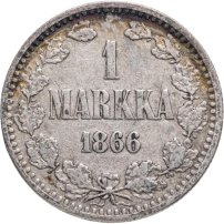В центре - надпись в три строки: «1»│«MARKAA»│«1866». Вдоль канта изображён не замкнутый венок из двух дубовых ветвей, которые, в нижней части, перевязаны лентой на узел двойным бантом. По окружности канта имеются рельефные элементы, выполненные в виде зубцов.