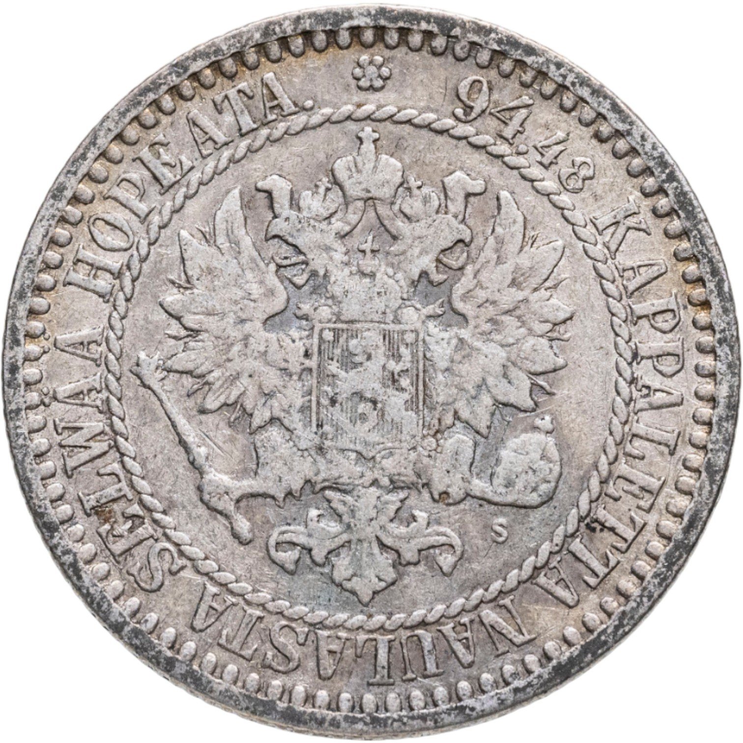 В центре изображён полный Герб Великого княжества Финляндского - двуглавый орёл, головы которого увенчаны двумя коронами, третья, большая корона над ними. Все они соединены орденской лентой ордена Св. Апостола Андрея Первозванного. На груди орла расположен щит с титульным гербом Великого князя Финляндского, увенчанный княжеской короной. Вокруг щита орденская цепь с орденом Св. Апостола Андрея Первозванного. В правой лапе орла – скипетр, в левой – держава. Под левой лапой знак директора Гельсингфосского монетного двора - литера «S», August Frederick Soldan (Август Фридрих Сольдан). Вокруг центрального изображения - витой ободок. За ободком круговая надпись: «94.48 KAPPALETTA NAULASTA SELWÄÄ HOPEATA», сверху разделённая цветочной розеткой. По окружности канта имеются рельефные элементы, выполненные в виде зубцов.