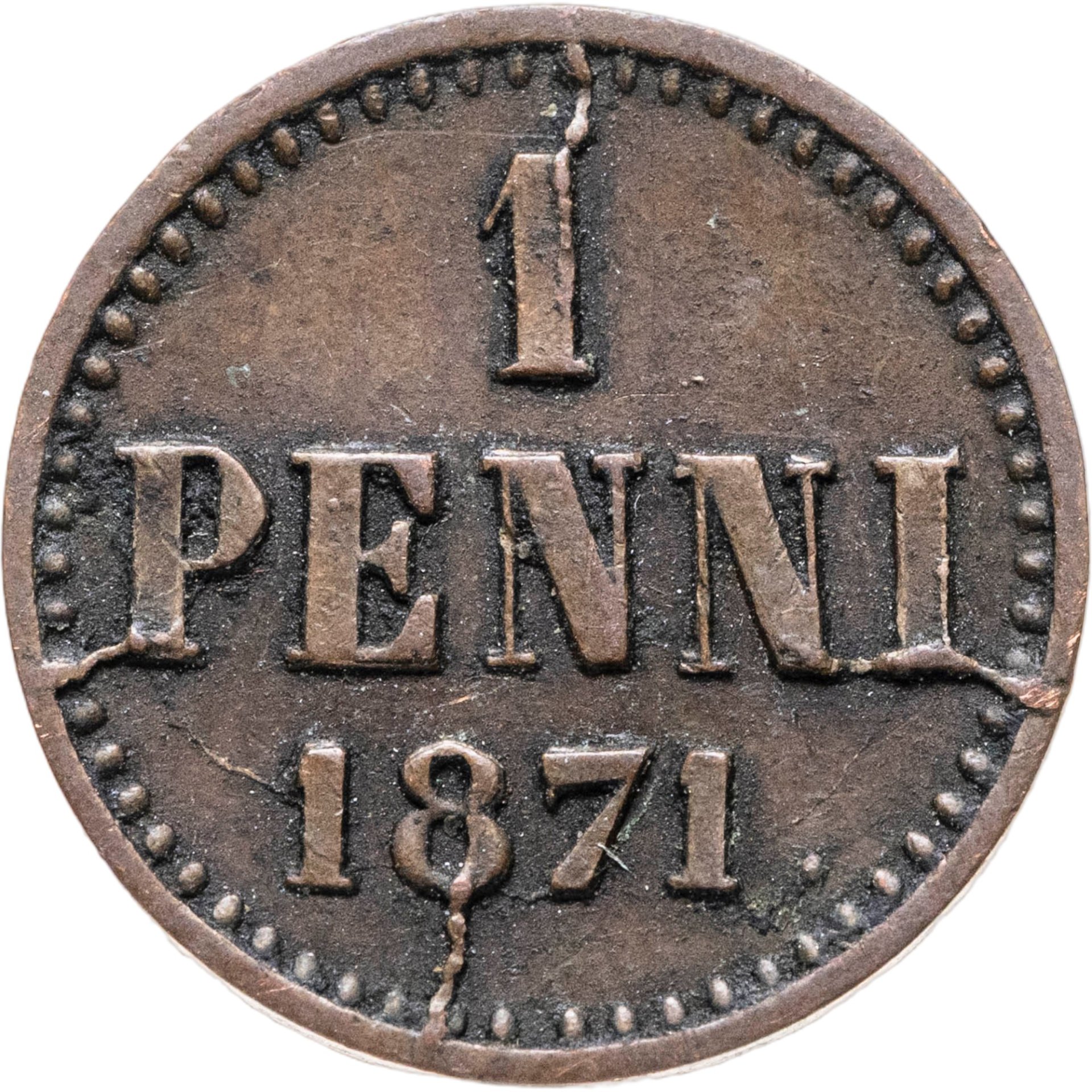 В центре надпись в три строки: «1»│«PENNI»│«1871.». По окружности канта имеются рельефные элементы, выполненные в виде точек.