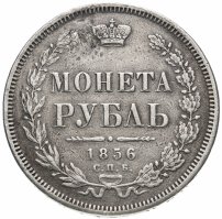 В центре указан номинал «МОНЕТА РУБЛЬ» в две строки. Над номиналом – Корона Российской империи. Под номиналом расположен декоративный разделитель в виде двух разнонаправленных фигурных линий и небольшой выпуклой точки между ними. Под разделителем — дата выпуска монеты «1856». Под цифрой даты — обозначение монетного двора «С.П.Б.». Вдоль канта, не доходя до короны, изображен венок из лавровой и дубовой ветви, которые в нижней части перевязаны лентой на узел бантом. По окружности канта имеются рельефные элементы, выполненные в виде зубцов.