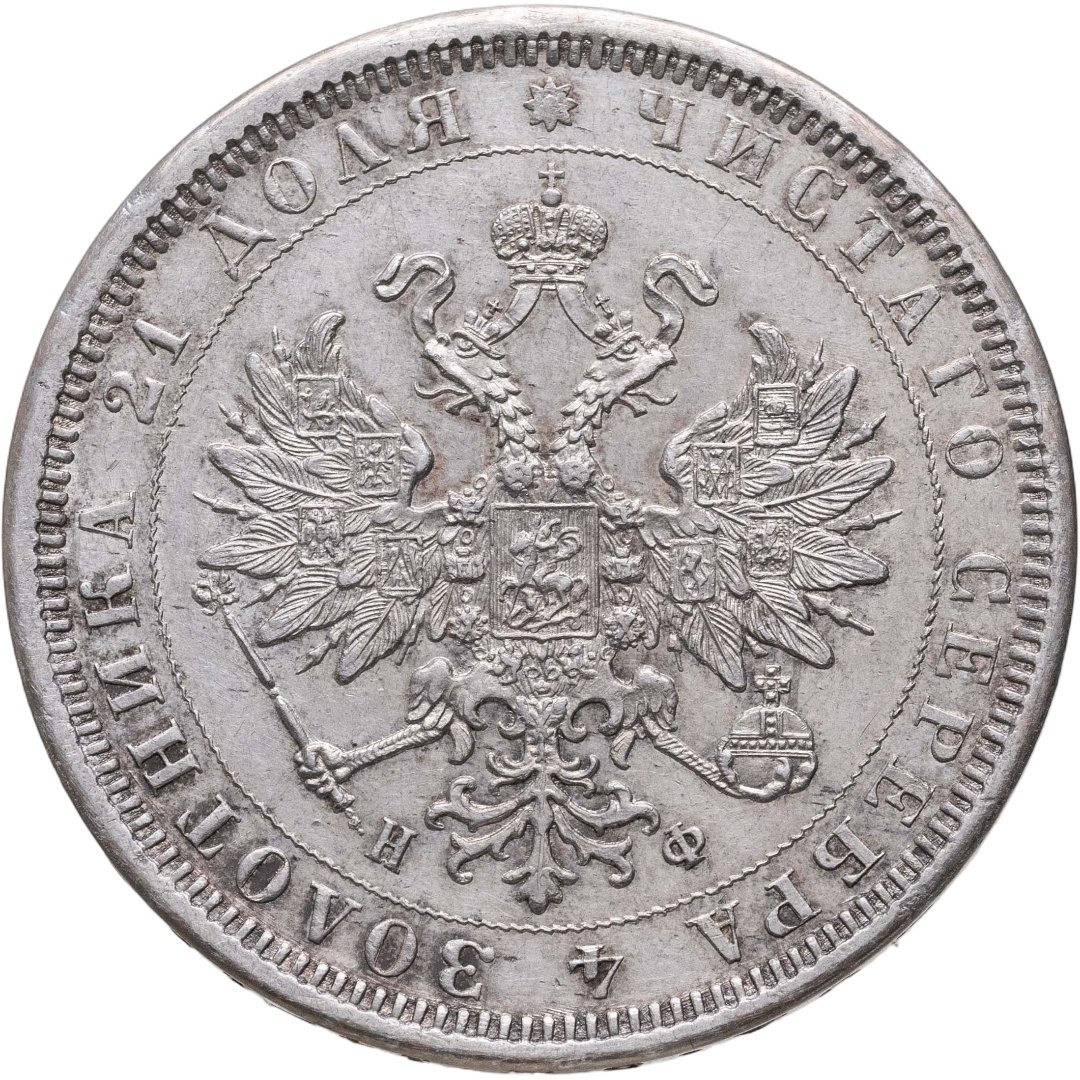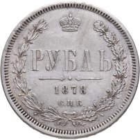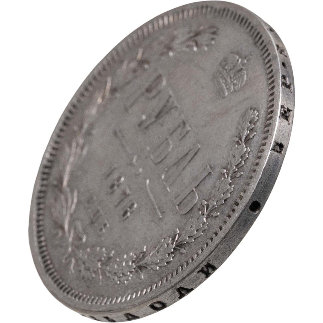 В центре указан номинал «РУБЛЬ». Над номиналом – Корона Российской империи. Под номиналом расположен декоративный разделитель в виде двух разнонаправленных фигурных линий и небольшой выпуклой точки между ними. Под разделителем — дата выпуска монеты «1878». Под цифрой даты — обозначение монетного двора «С.П.Б.». Вдоль канта, не доходя до короны, изображен венок из лавровой и дубовой ветви, которые в нижней части перевязаны лентой на узел бантом. По окружности канта имеются рельефные элементы, выполненные в виде зубцов.