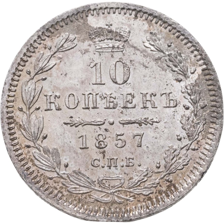 В центре указан номинал «10». Над цифрой – Корона Российской империи. Под цифрой номинала — слово "КОПЕЕК". Ниже, расположен декоративный разделитель в виде двух разнонаправленных фигурных линий и небольшой выпуклой точки между ними. Под разделителем — дата выпуска монеты «1857». Под цифрой даты — обозначение монетного двора «С.П.Б.». Вдоль канта, не доходя до короны, изображен венок из лавровой и дубовой ветви, которые в нижней части перевязаны лентой на узел бантом. По окружности канта имеются рельефные элементы, выполненные в виде зубцов.