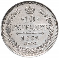 10 копеек 1861 СПБ без инициалов минцмейстера