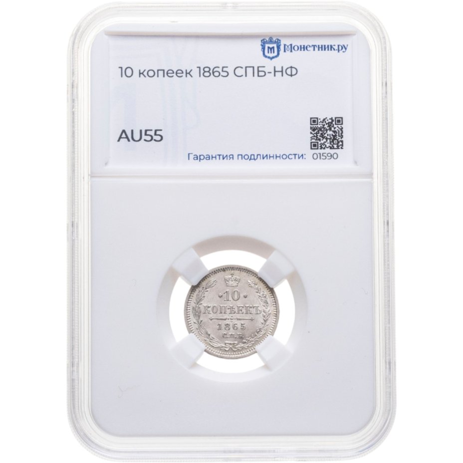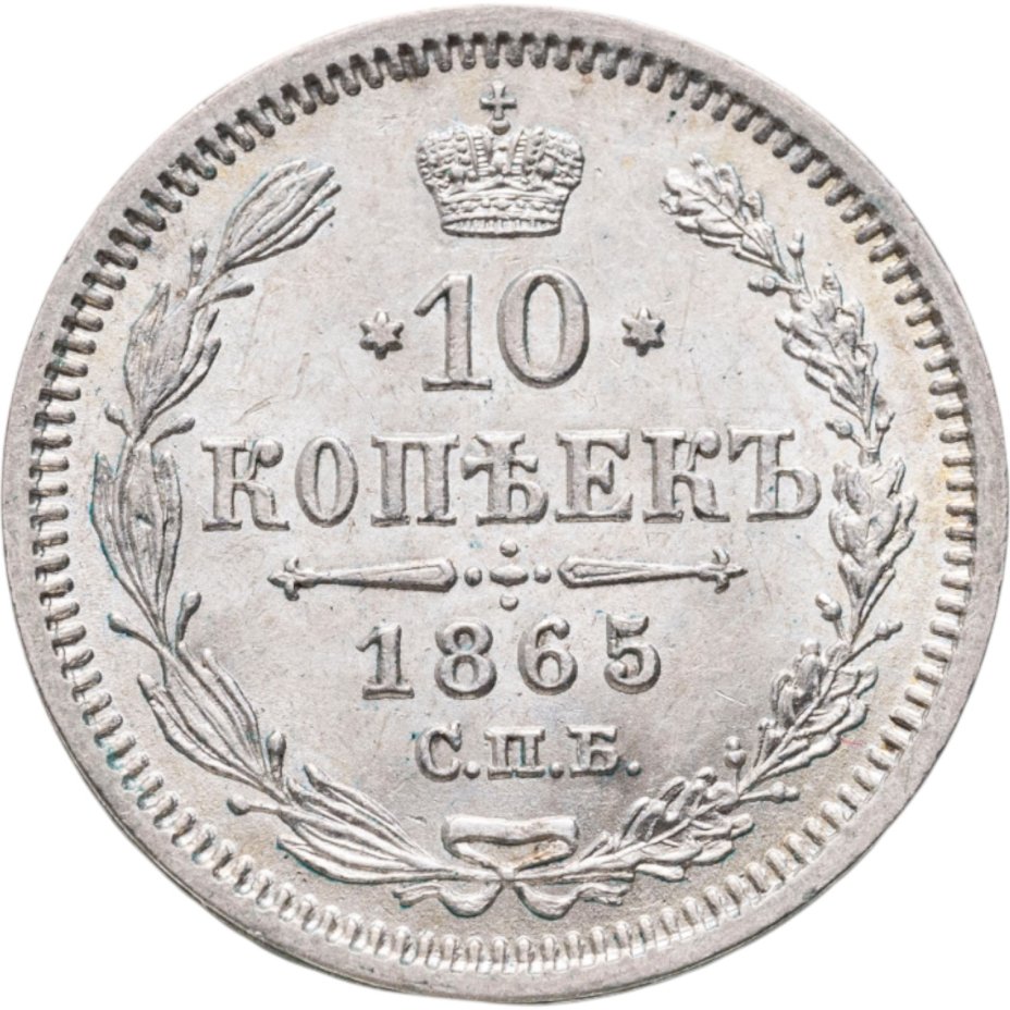 В центре указан номинал «10», ограниченный с обеих сторон шестиконечными звездочками. Над цифрой – Корона Российской империи. Под цифрой номинала — слово "КОПЕЕК". Ниже, расположен декоративный разделитель в виде двух разнонаправленных фигурных линий и стилизованным из точек крестом между ними. Под разделителем — дата выпуска монеты «1865». Под цифрой даты — обозначение монетного двора «С.П.Б.». Вдоль канта, не доходя до короны, изображен венок из лавровой и дубовой ветви, которые в нижней части перевязаны лентой на узел бантом. По окружности канта имеются рельефные элементы, выполненные в виде зубцов.