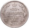 В центре указан номинал - «10», ограниченный с обеих сторон шестиконечными звездочками. Над цифрой – Корона Российской империи. Под цифрой номинала — слово "КОПЕЕК". Ниже, расположен декоративный разделитель в виде двух разнонаправленных фигурных линий и стилизованным из точек крестом между ними. Под разделителем — дата выпуска монеты «1867». Под цифрой даты — обозначение монетного двора «С.П.Б.». Вдоль канта, не доходя до короны, изображен венок из лавровой и дубовой ветви, которые, в нижней части, перевязаны лентой на узел бантом. По окружности канта имеются рельефные элементы, выполненные в виде зубцов.