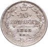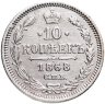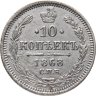 В центре указан номинал - «10», ограниченный с обеих сторон шестиконечными звездочками. Над цифрой – Корона Российской империи. Под цифрой номинала — слово "КОПЕЕК". Ниже, расположен декоративный разделитель в виде двух разнонаправленных фигурных линий и стилизованным из точек крестом между ними. Под разделителем — дата выпуска монеты «1868». Под цифрой даты — обозначение монетного двора «С.П.Б.». Вдоль канта, не доходя до короны, изображен венок из лавровой и дубовой ветви, которые, в нижней части, перевязаны лентой на узел бантом. По окружности канта имеются рельефные элементы, выполненные в виде зубцов.