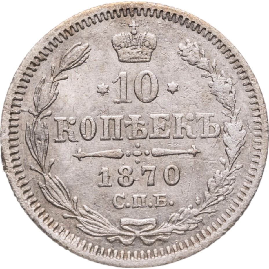 В центре указан номинал - «10», ограниченный с обеих сторон шестиконечными звездочками. Над цифрой – Корона Российской империи. Под цифрой номинала — слово "КОПЕЕК". Ниже, расположен декоративный разделитель в виде двух разнонаправленных фигурных линий и стилизованным из точек крестом между ними. Под разделителем — дата выпуска монеты «1870». Под цифрой даты — обозначение монетного двора «С.П.Б.». Вдоль канта, не доходя до короны, изображен венок из лавровой и дубовой ветви, которые, в нижней части, перевязаны лентой на узел бантом. По окружности канта имеются рельефные элементы, выполненные в виде зубцов.