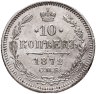 В центре указан номинал - «10», ограниченный с обеих сторон шестиконечными звездочками. Над цифрой – Корона Российской империи. Под цифрой номинала — слово "КОПЕЕК". Ниже, расположен декоративный разделитель в виде двух разнонаправленных фигурных линий и стилизованным из точек крестом между ними. Под разделителем — дата выпуска монеты «1872». Под цифрой даты — обозначение монетного двора «С.П.Б.». Вдоль канта, не доходя до короны, изображен венок из лавровой и дубовой ветви, которые, в нижней части, перевязаны лентой на узел бантом. По окружности канта имеются рельефные элементы, выполненные в виде зубцов.
